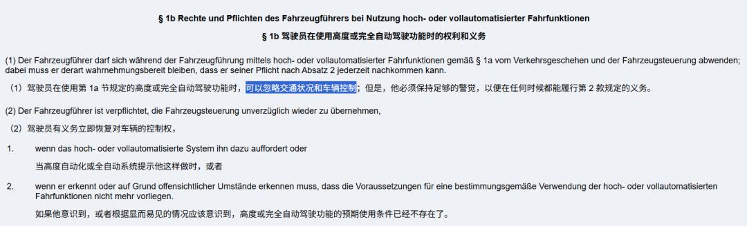 在德国,L3 级自动驾驶有着明确的严格划分,他们的《 道路交通安全法 》里是这么说的,说人们在驾驶员在自动驾驶激活期间,可以不关注路面的交通信息。