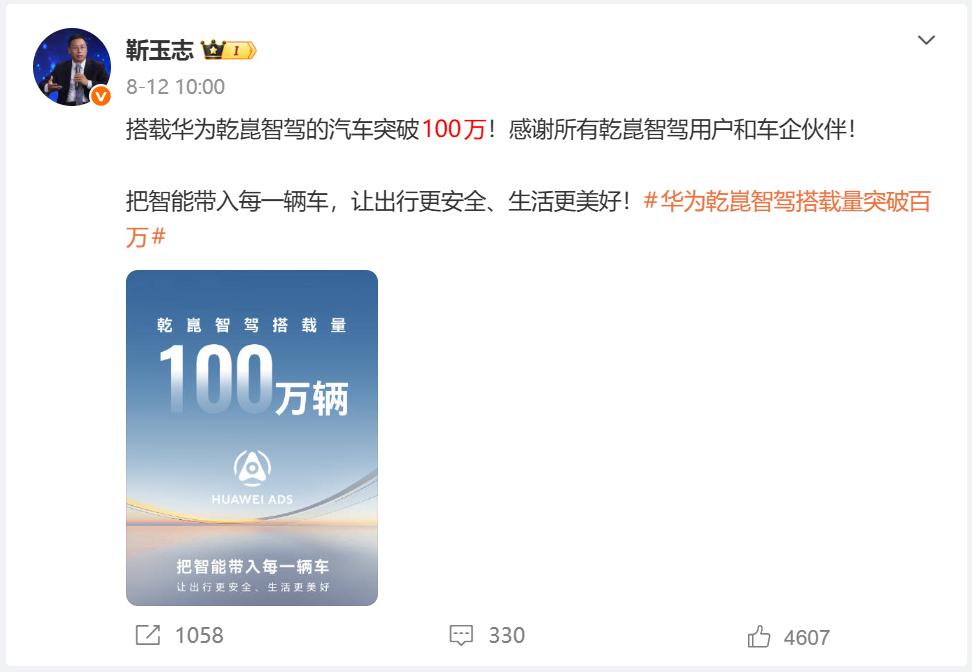 图片来源:华为智能汽车解决方案BU CEO 靳玉志 微博