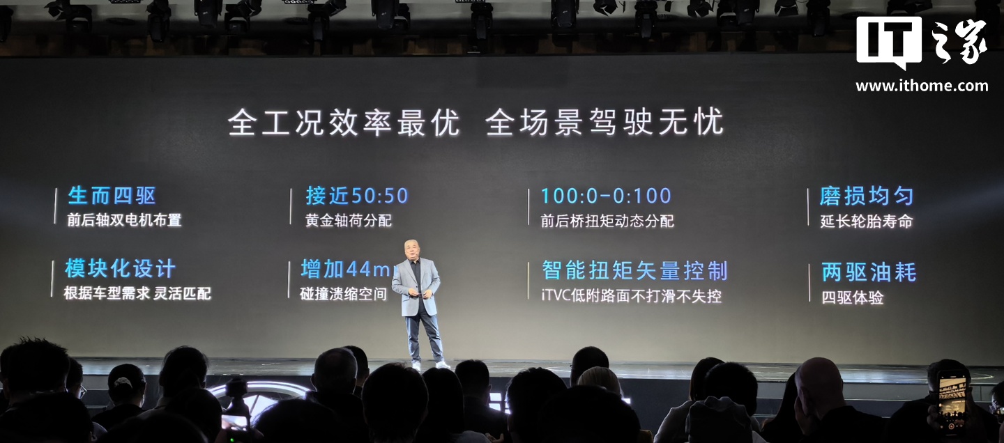 IT之家从发布会获悉,该平台支持 FCEV 氢燃料系统、ICE 高效燃油系统、BEV 纯电动系统、HEV 油电混动系统、PHEV 插电混动系统。平台支持前后轴双电机布置、模块化设计、智能扭矩矢量控制等。