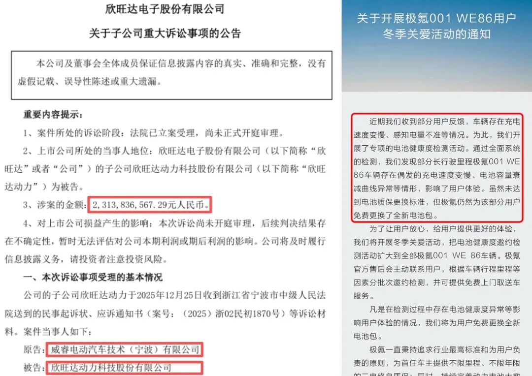 电池“抽盲盒”的现象在2025年随着市场竞争加剧,以更复杂的形式持续消耗着用户的信任。2025年底,一场高达23.14亿元的诉讼将电池信息不透明的质量风险推至台前。极氪因其早期车型搭载的欣旺达电池存在质量问题,对供应商提起诉讼。此前,大量极氪车主投诉车辆存在充电速度变慢、冬季续航异常衰减等问题,迫使极氪为受影响车主免费更换为宁德时代电池包。