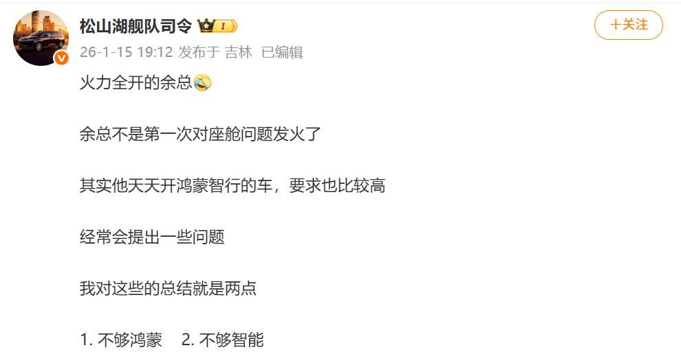 有科技博主透露,余承东不是第一次对座舱问题发火,其实他天天开鸿蒙智行的车,要求也比较高,经常会提出一些问题,一是不够鸿蒙,而是不够智能。