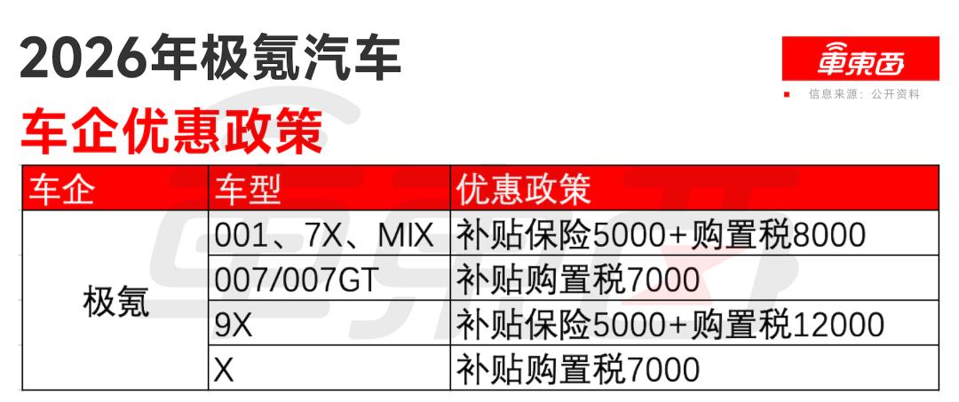 极氪001、7X、MIX等核心车型提供“5000元保险补贴+8000元购置税补贴”。顶级车型极氪9X的补贴总额更是高达1.7万元。