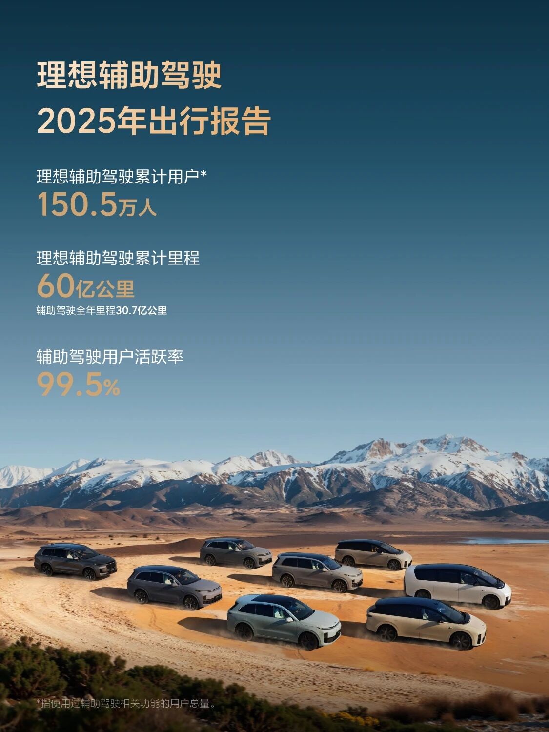 IT之家 1 月 18 日消息,理想汽车官方今日发布了“理想辅助驾驶 2025 年出行报告”。据介绍,理想辅助驾驶累计用户 150.5 万人、理想辅助驾驶累计里程 60 亿公里(辅助驾驶全年里程 30.7 亿公里)、辅助驾驶用户活跃率 99.5%。