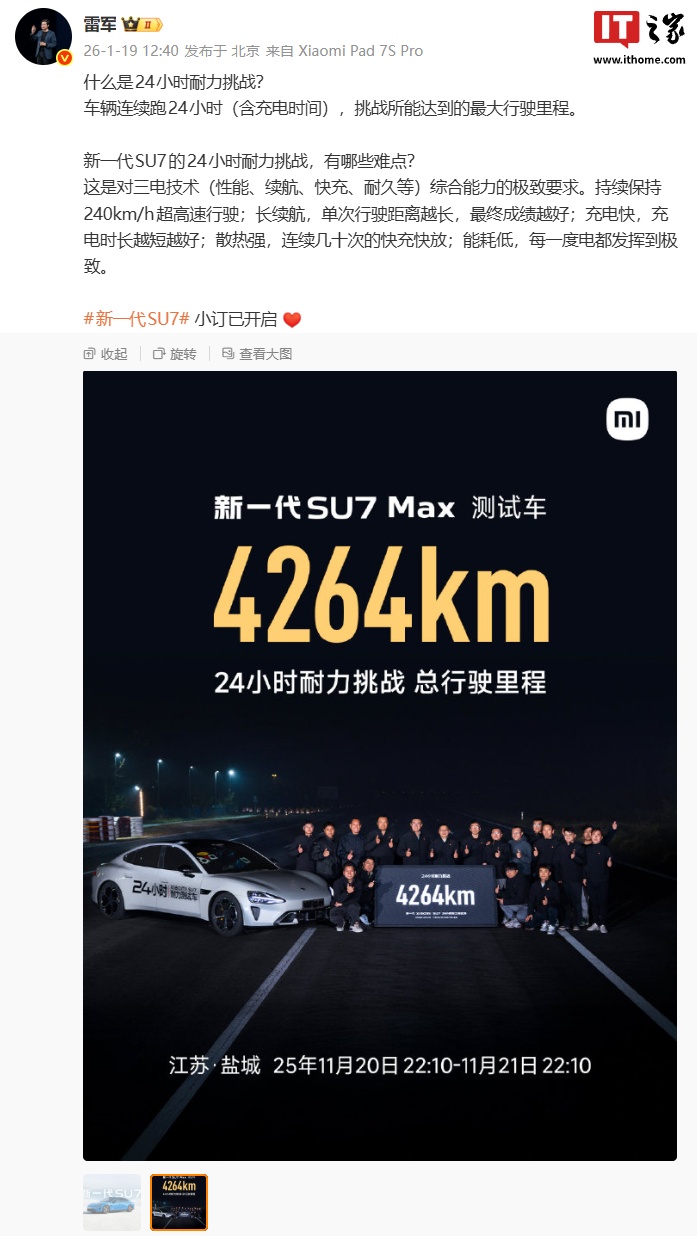 IT之家 1 月 19 日消息,今天上午,小米汽车官微宣布:新一代 SU7 Max 取得 4264km 总行驶里程的 24 小时耐力挑战成绩,号称“用短跑速度跑马拉松”。