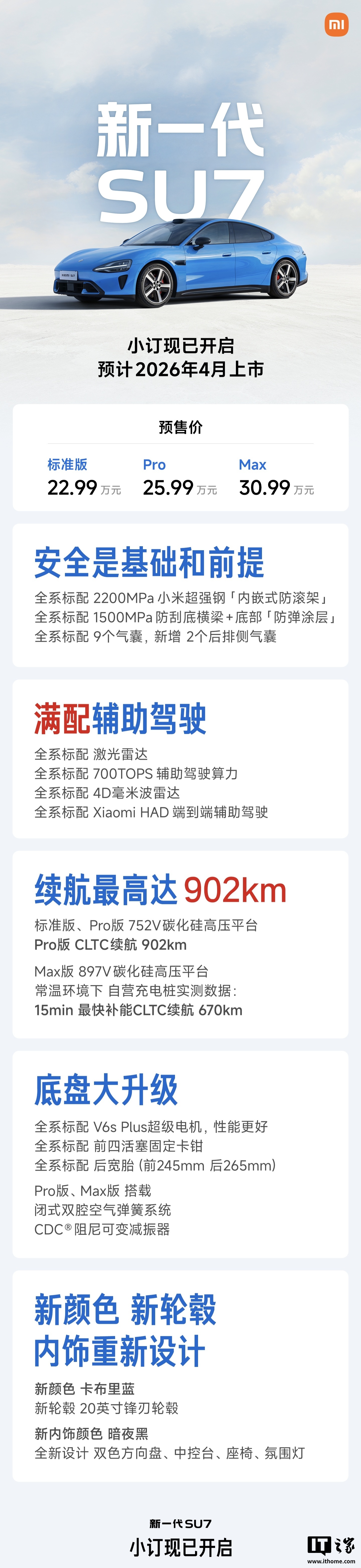 据IT之家了解,新一代 SU7 全系搭载小米 V6s Plus 超级电机,最高转速提升至 22000rpm,CLTC 综合效率提升 1.5%,标准版 / Pro 版功率提升 15kW,Max 版功率提升 13kW。在相同的电量下,续航里程可以提升十余公里。