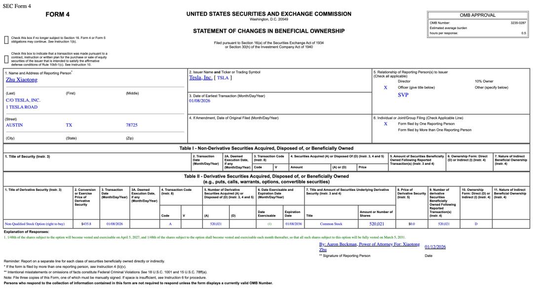 根据特斯拉向美国证券交易委员会(SEC)提交的Form 4文件,朱晓彤获授的520,021份股票期权,行权价为每股435.80美元。