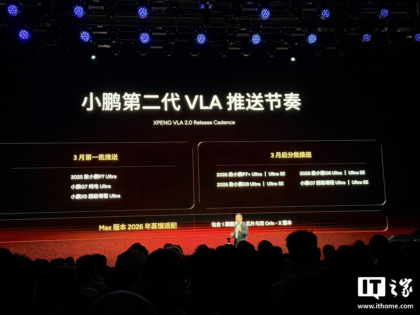 另外,在 2026 小鹏全球新品发布会上,小鹏汽车董事长何小鹏还公布了第二代 VLA 推送节奏:3 月第一批推送、3 月后分批推送。