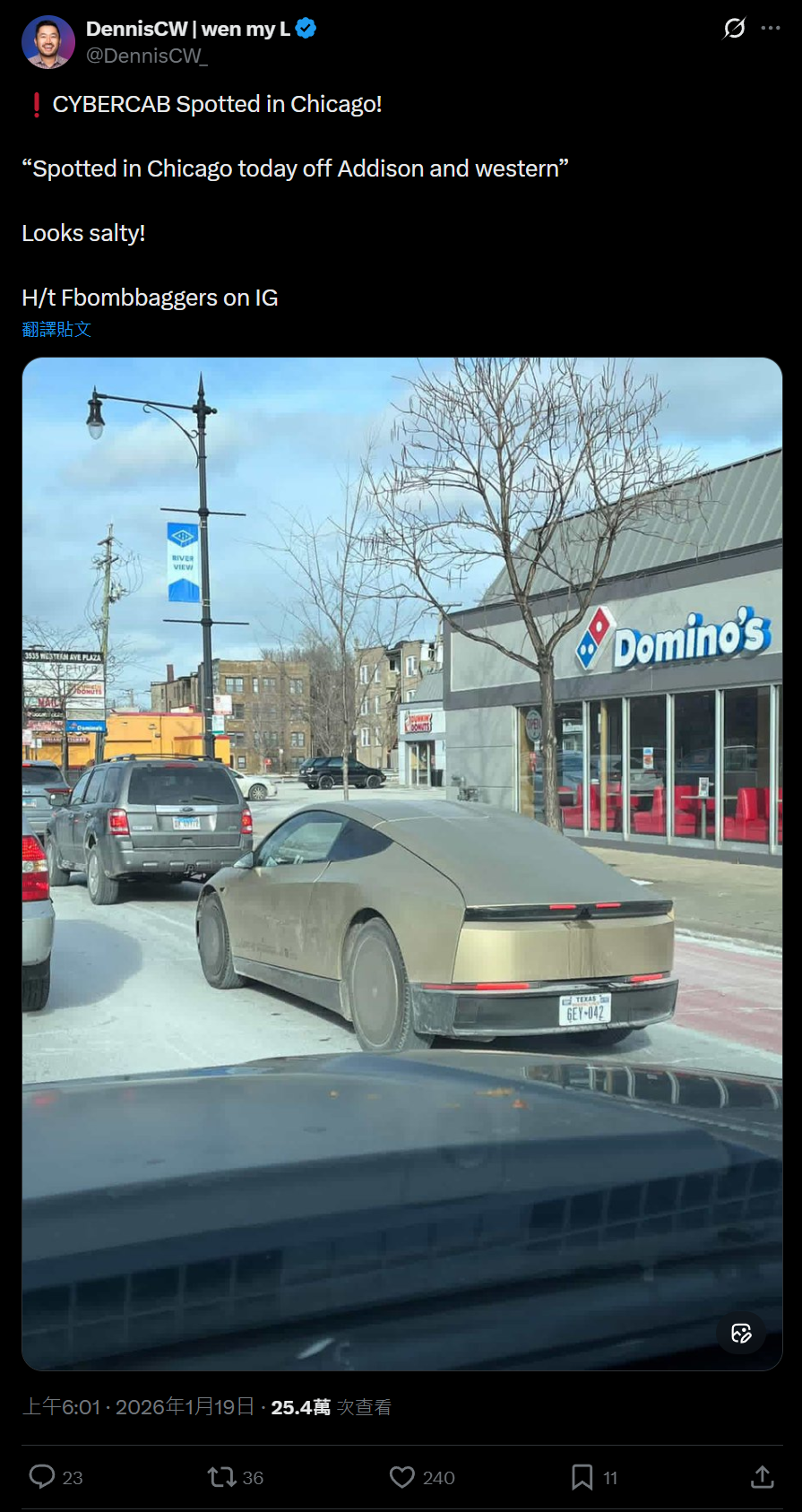 IT之家 1 月 19 日消息,汽车博主 Sawyer Merritt 今天在 X 平台发文,分享自己在美国芝加哥拍到的特斯拉 Cybercab 无人驾驶出租车。