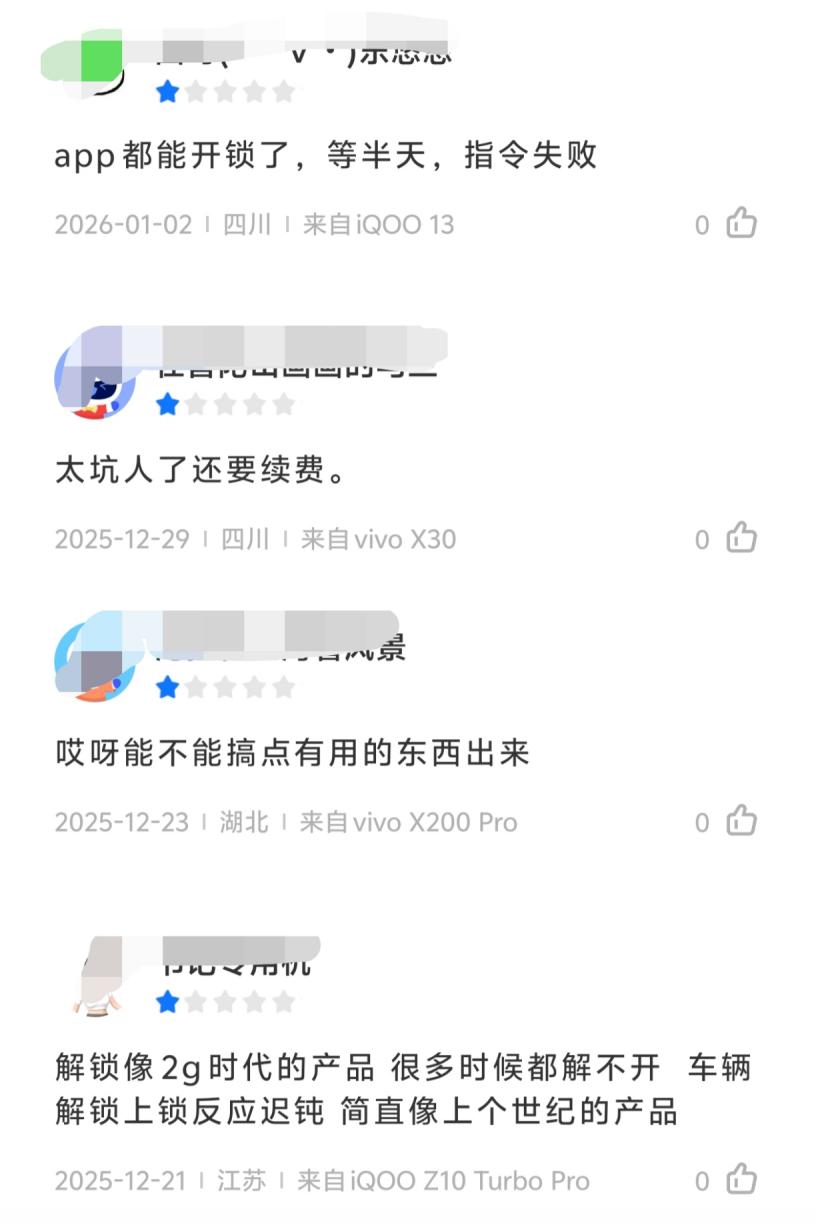 《次世代车研所》栏目看到,在超过1500条应用评论中,打1分的车主比例最高。不少车主吐槽称,“车辆解锁上锁反应迟钝,简直像20世纪的产品”,“太抽象了,App都整不明白”,“功能单一还残废”。