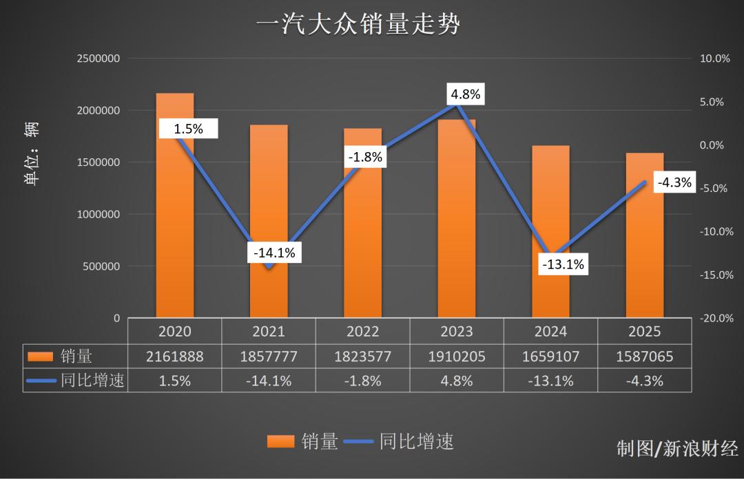 《次世代车研所》栏目梳理发现,早在2020年时,一汽大众的销量就面临着增长瓶颈,当年增速仅为1.5%;2021年和2022年均出现同比下滑,分别达14.1%和1.8%;2023年短暂出现销量回升;2024年和2025年再次陷入下滑泥潭,分别为13.1%和4.3%。