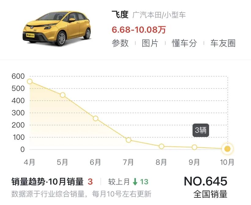 去年 10 月,飞度的全国销量跌到 3 台 已经足够恐怖了;但更绝的是,接下来的 11、12 月,它直接榜上无名,销量挂 0。哪怕算上去年全年的累计销量,一共也才卖了 2695 台。