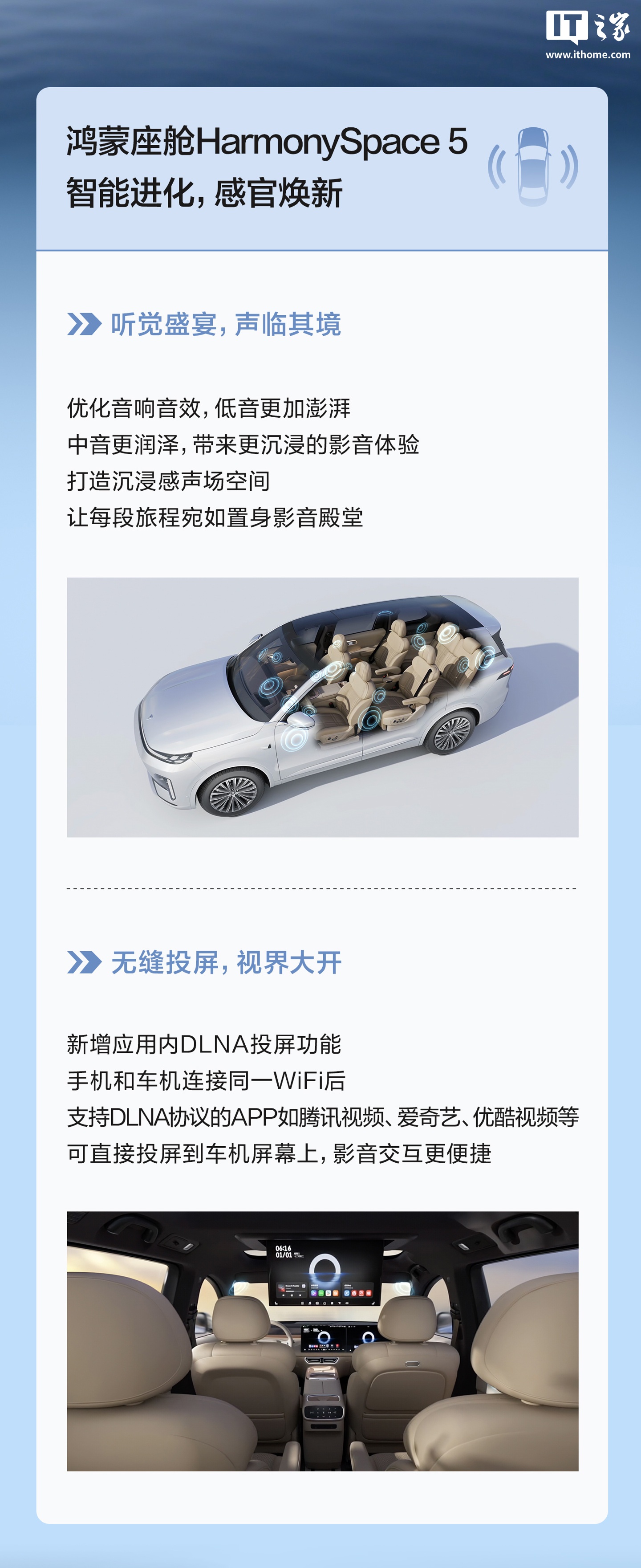 新增应用内 DLNA 投屏:手机和车机连接同一 WiFi 后,支持 DLNA 协议的 App(如腾讯视频、爱奇艺、优酷视频等)可直接投屏到车机屏幕上