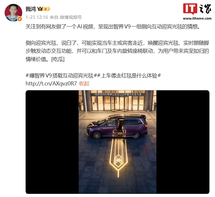 博主 @我鸿 分享了 AI 制作的智界 V9 侧向迎宾光毯的效果视频,称其可能实现当车主或宾客走近,唤醒迎宾光毯,实时跟随脚步触发动态交互功能,并可以和车门及车内旋转座椅联动。