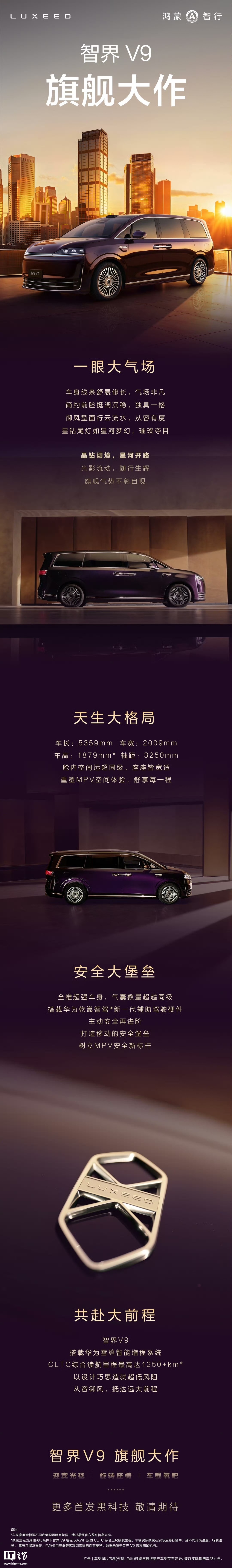 据此前官方介绍,这款新车作为“旗舰大作”将拥有“远超同级”的舱内空间,更号称将重塑 MPV 空间体验。新车长宽高分别为 5359/2009/1879mm,轴距 3250mm。