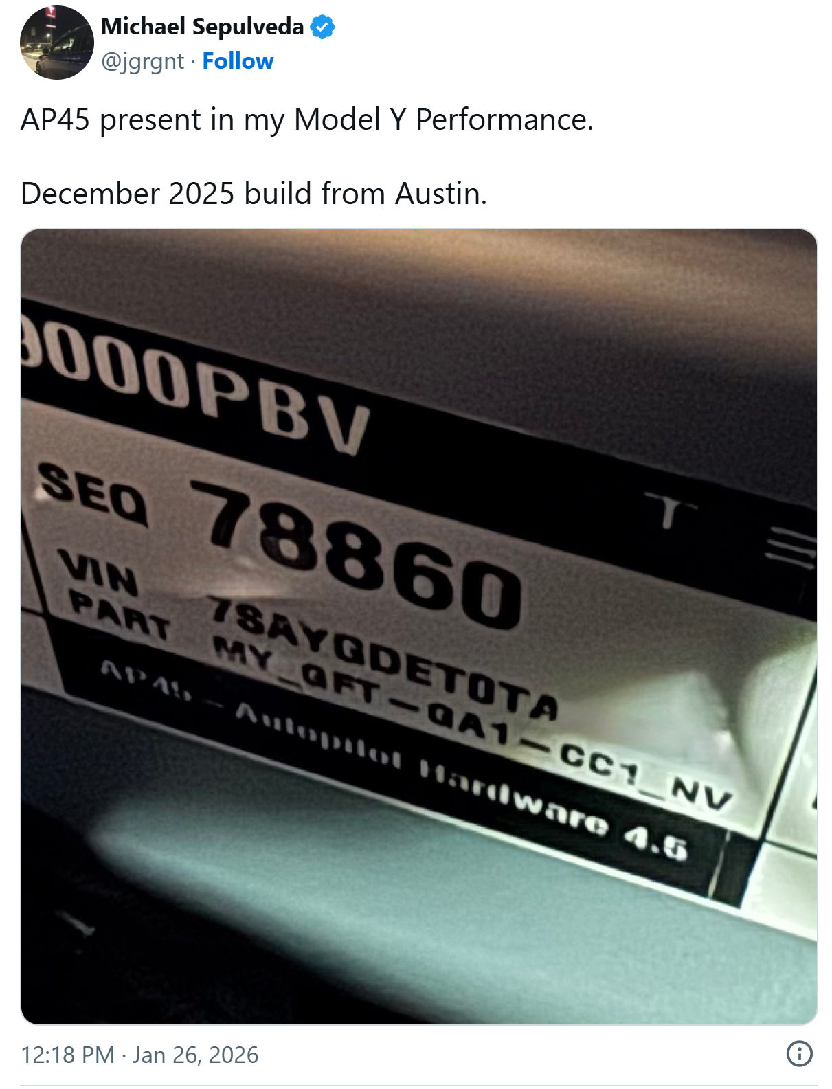 随后另一位 Model Y 性能版车主表示,他的汽车在 2025 年 12 月生产,手套箱内同样带有“AP45-Autopilot Hardware 4.5”标识;而拥有一辆来自奥斯汀工厂的 Model Y 性能版车主 @Michael Sepulveda 同样分享了手套箱照片,显示这辆汽车同样搭载“AP45”硬件。