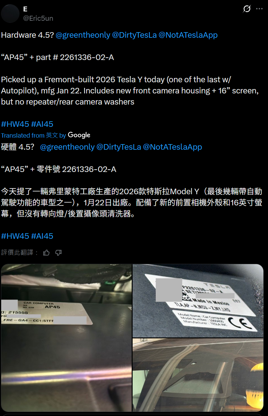 其中车主 @Eric5un 昨天表示,他提了一台弗里蒙特工厂生产的 2026 款 Model Y 全轮驱动 Premium 版,这款汽车搭载了 16 英寸中控屏,手套箱下方拥有型号为“AP45”的辅助驾驶计算机,零件编号“2261336-02-A”。