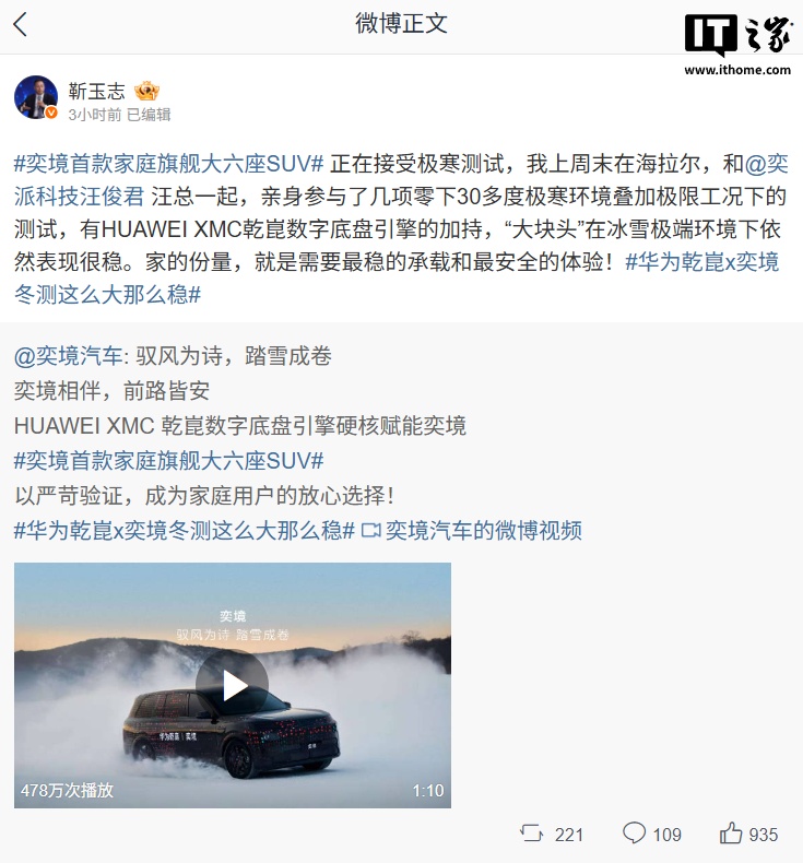 IT之家 1 月 26 日消息,奕境汽车今日发布旗下首款家庭旗舰大六座 SUV 冬测视频,4 月北京车展见,华为智能汽车解决方案 BU CEO 靳玉志进行了转发。