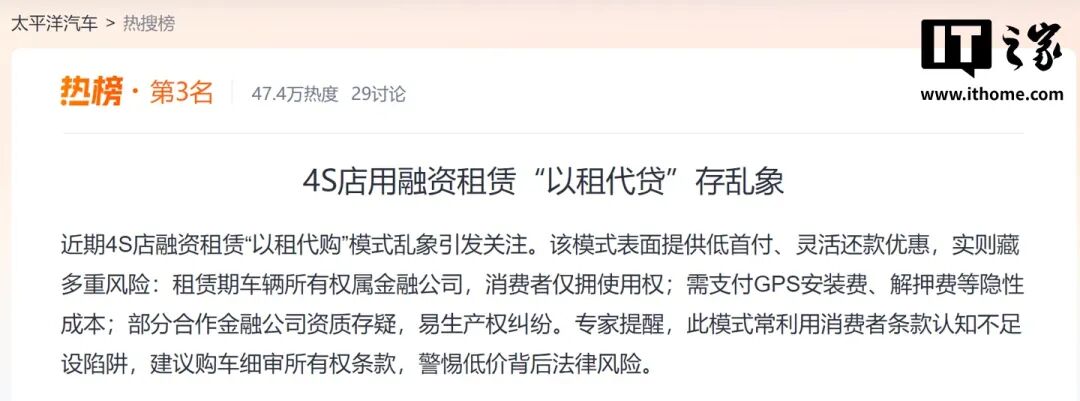 而就在今天(1 月 26 日),“4S 店用融资租赁以租代贷存乱象”登上太平洋汽车的热榜。