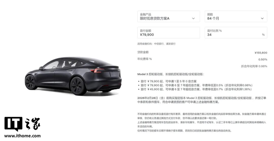 在 1 月 31 日前下单 Model 3 或 Model Y,可享 7 年超低息,首付 7.99 万元,月供低至 1918 元。