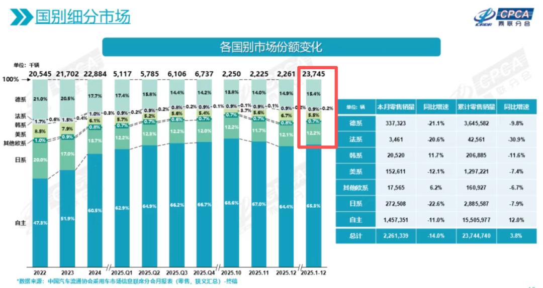 乘联分会数据显示,韩系品牌的市场份额从2020年的3.8%,一路收缩至2025年的0.9%。与之形成鲜明对比的是,尽管同样承压,日系和德系品牌同期的市场份额仍分别保持在12.2%和15.4%左右。