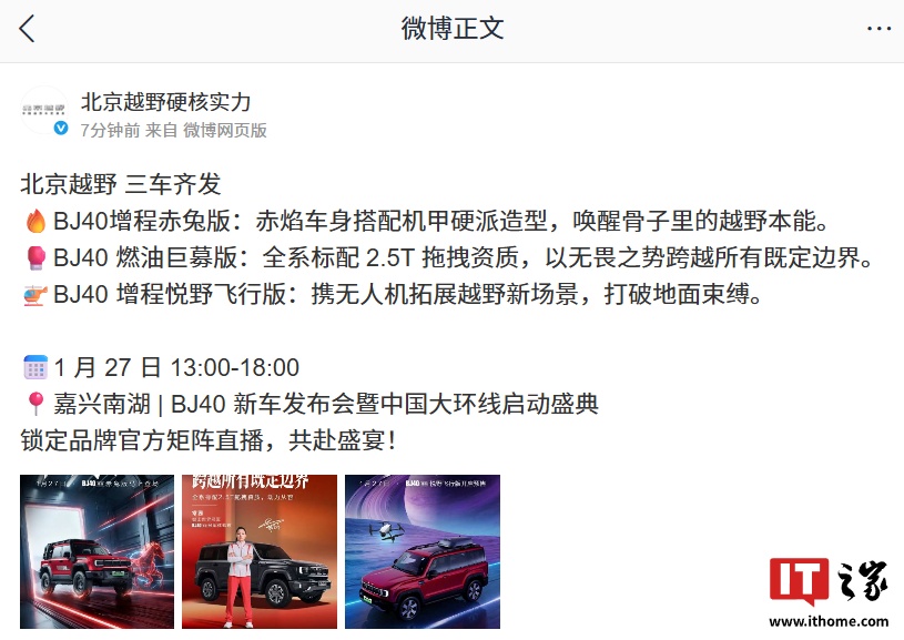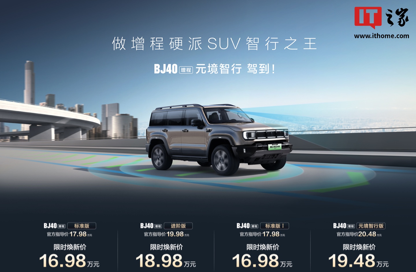 IT之家 1 月 26 日消息,北京越野今日宣布,BJ40 增程悦野飞行版汽车将于 1 月 27 日开启预售,同步亮相的还有 BJ40 燃油巨幕版和 BJ40 增程赤兔版。