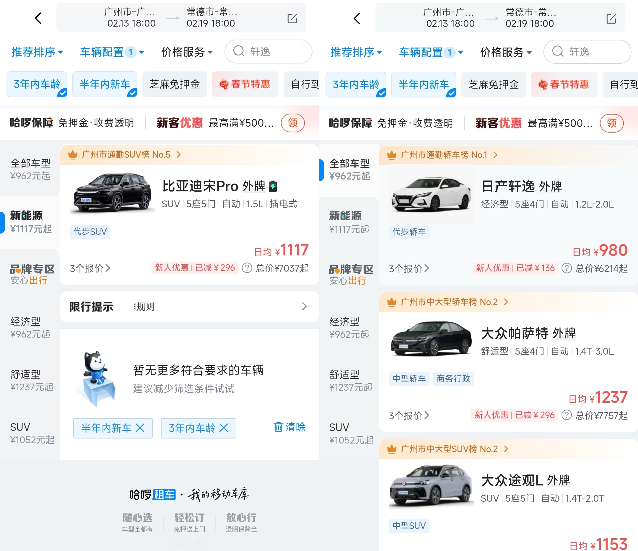 接下来我们以在“广东广州租一辆车回湖南常德,2月13日取、2月14日还”为例,看看三个自营平台的价格和服务有何不同。