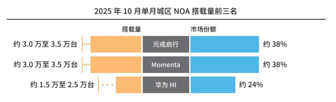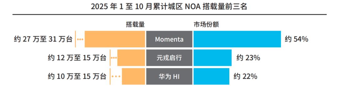 据《中国智能驾驶行业趋势白皮书(2025)》(下称“白皮书”),1 - 10月,Momenta、元戎启行、华为HI位列城区NOA搭载量(第三方市场)前三名,分别为54%、23%和22%;其中,在10月的单月城区NOA搭载量中,元戎启行表现突出,位居行业第一。