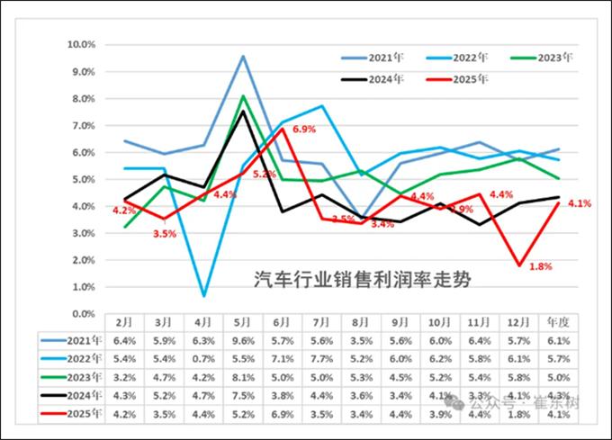 而眼下,当乘联会秘书长崔东树指出,2025年1~12月行业销售利润率降至4.1%,创下历史新低。其中12月1.8%的利润率也创下近期低点,环比下降2.6个百分点,同比下降2.3个百分点。