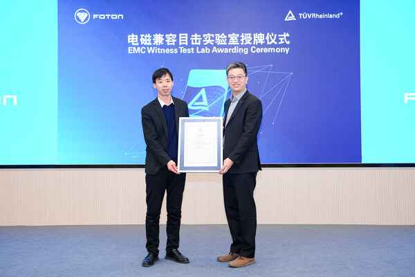 北京2026年1月28日 /美通社/ -- 1月23日,国际独立第三方检测、检验和认证机构德国莱茵TÜV大中华区(以下简称"TÜV莱茵")与北汽福田汽车股份有限公司(以下简称"北汽福田")举行电磁兼容目击实验室授牌仪式,标志着北汽福田试验中心电磁兼容实验室正式获得E-mark认证TÜV莱茵目击实验室资质。北汽福田业务副总裁、海外事业部总裁付军,工程研究总院常务副院长郭凤刚、海外事业部研发副总裁王秋香,TÜV莱茵大中华区交通服务高级副总裁黄余欣、销售总经理李卫英等双方代表出席了授牌仪式。