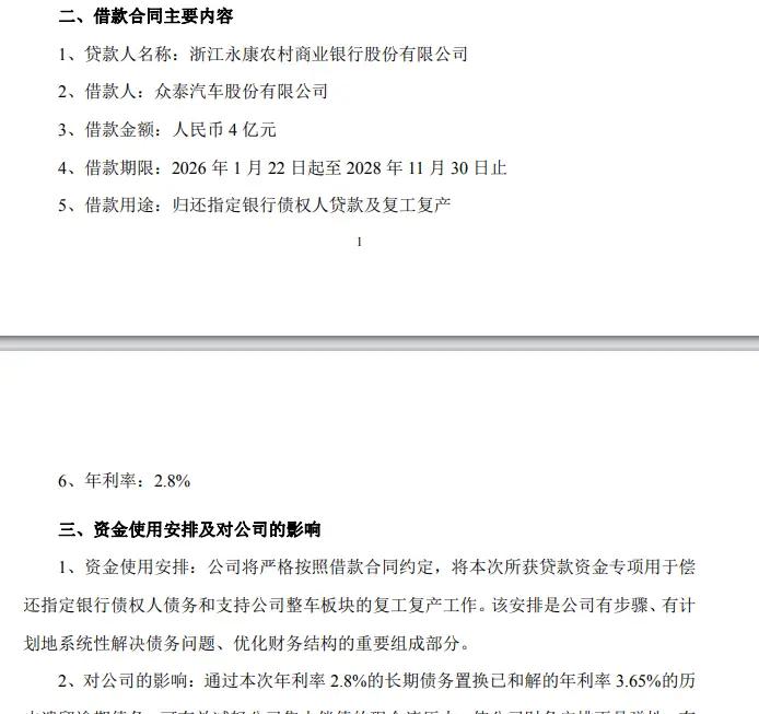 而这笔4亿元贷款则是属于此前去年年底永康农商行意向性授予众泰汽车5亿元综合预授信额度内,且处于公司2025年股东大会授权的45亿元总授信框架下,借款期限2026年1月22日起至2028年11月30日止。