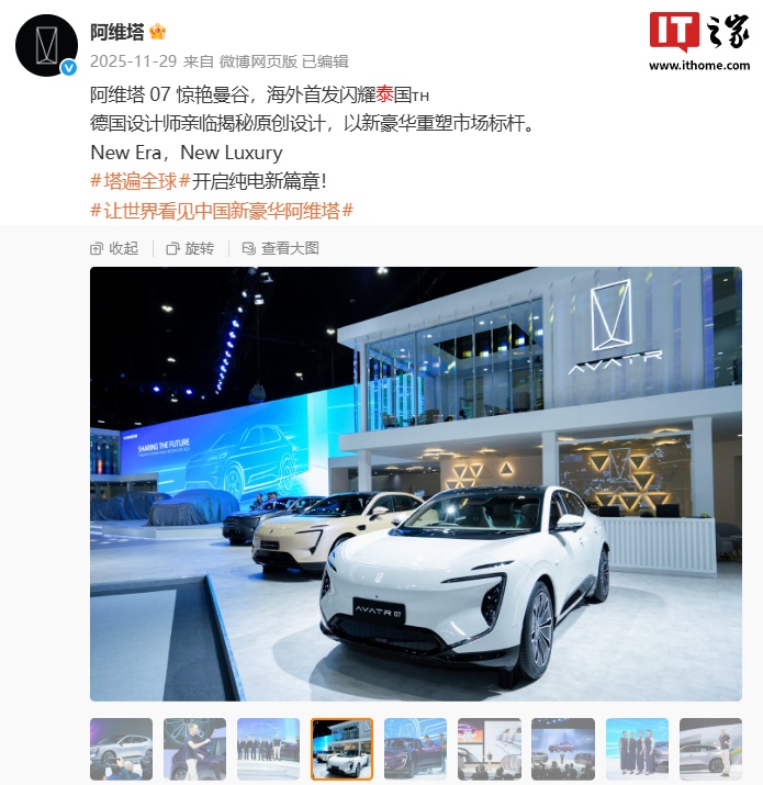 2023 年 11 月,阿维塔携旗下双旗舰车型阿维塔 11、阿维塔 12 首度亮相泰国,并宣布将进入东南亚汽车市场。IT之家注意到,阿维塔 07 已于去年 11 月在泰国海外首发。