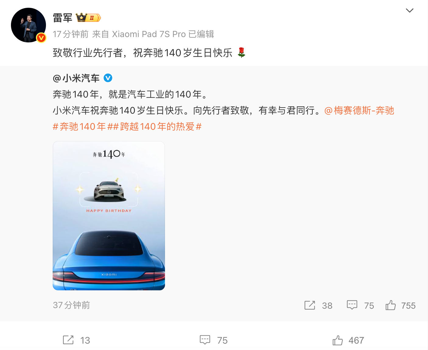 凤凰网科技讯 1月29日,小米创办人,董事长兼CEO雷军转发“小米汽车”的文章并称:致敬行业先行者,祝奔驰140岁生日快乐。“小米汽车”称,奔驰140年,就是汽车工业的140年。