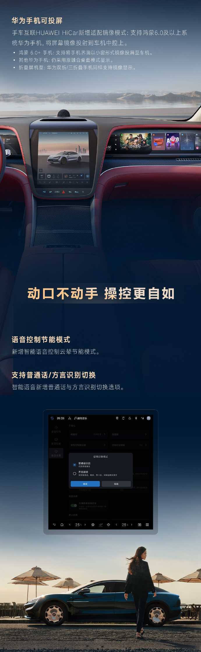 华为手机可投屏,手车互联 HUAWEI HiCar 新增适配镜像模式:支持鸿蒙 6.0 及以上系统华为手机,将屏幕镜像投射到车机中控上。