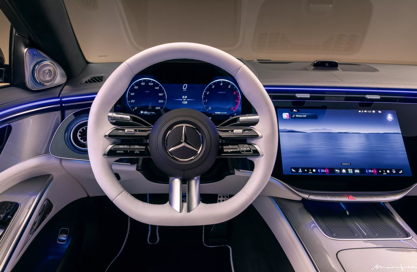 相比外观的小幅进化,座舱变化堪称脱胎换骨。以往的木饰板让位于密集屏幕布局,包含 12.3 英寸仪表、14.4 英寸中控屏,以及 12.3 英寸副驾屏。为了适配这些屏幕,奔驰重新设计了仪表台与中控区域,新增双无线充电与发光杯架区域。