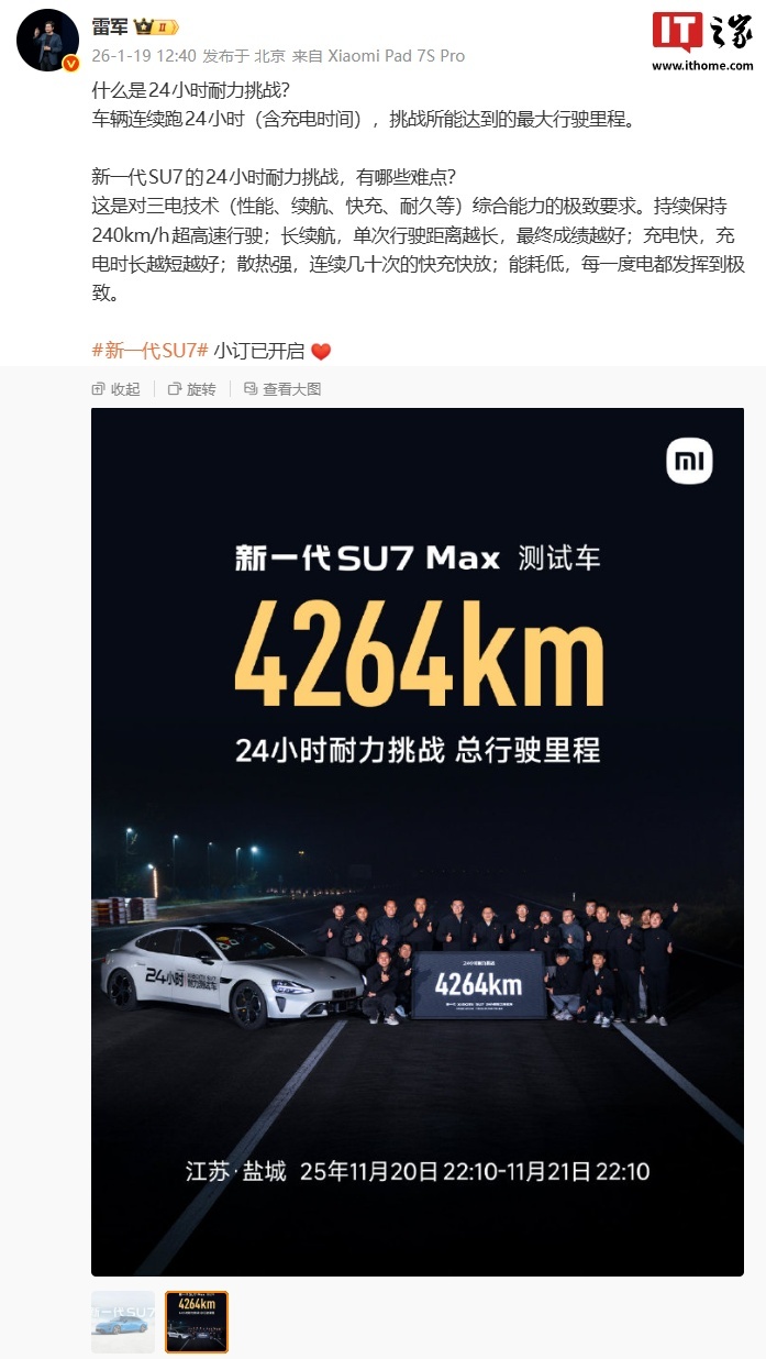 《小米雷军:新一代 SU7 的 24 小时耐力挑战是对三电技术综合能力的极致要求》