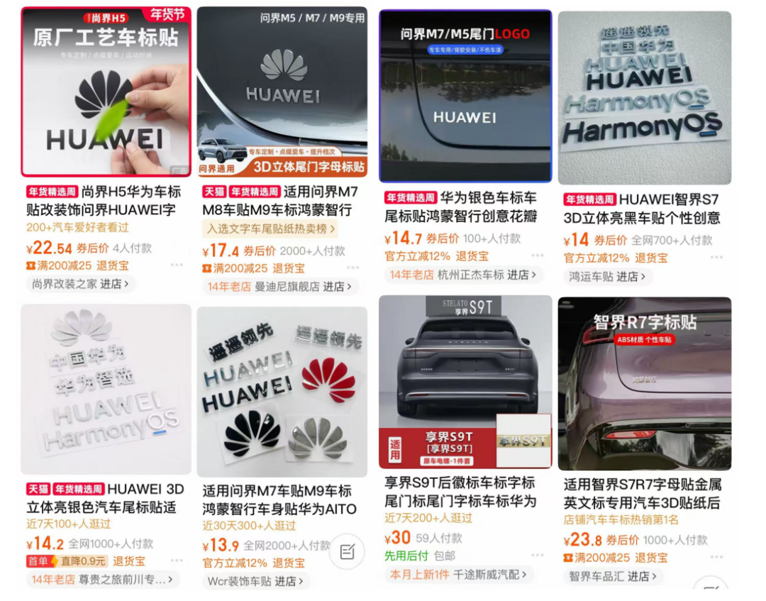 不少车主抠掉 “赛力斯”尾标,贴上了“HUAWEI”的标识。直到目前,“HUAWEI”车尾标依然在电商平台售卖,销量并不算低。