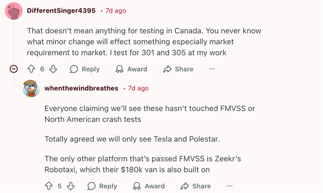 中国电车还需要面对全新的安全标准,这也拉长了加拿大消费者的等待时间。加拿大采用与美国一致的 FMVSS 体系,对结构、电池和软件安全的要求与欧盟有所差异。而由于过往北美市场对中国电车大门紧闭,少有中国车企会针对这套安全标准设计电动汽车。