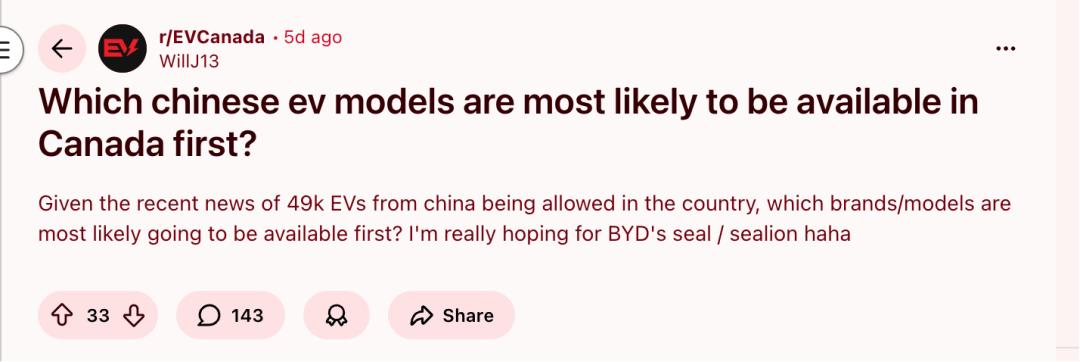回看这场讨论,加拿大消费者对电动汽车的畅想与疑问,短期内还无法得到回答。但4.9万辆低税名额,足以让问题被认真提出。而这,或许正是这项政策最真实的意义。