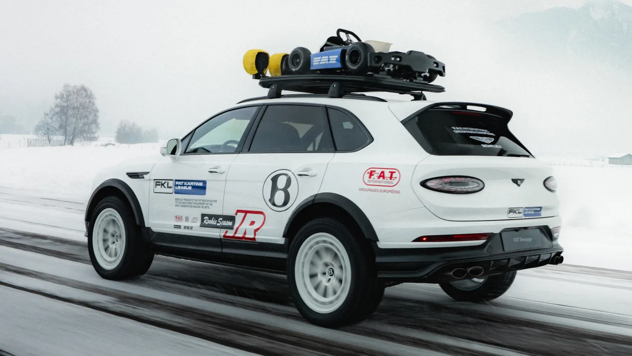 外观上,宾利还增加了车顶储物舱,内含一辆电动卡丁车,并配有四盏超大探照灯、双拖车钩,采用高山白涂装与白色轮圈,整体更有探险装备感。