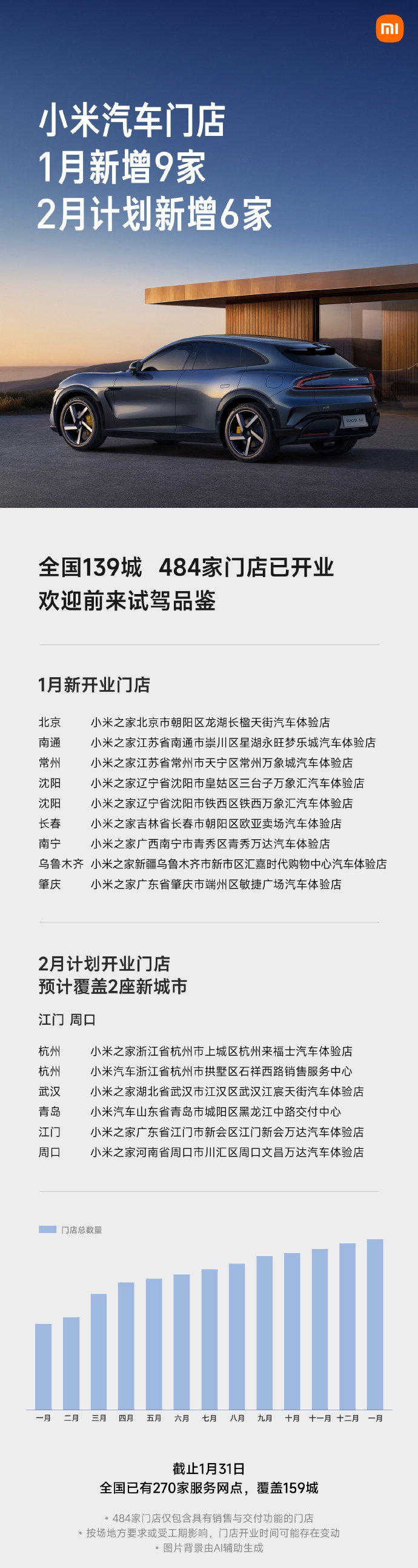 IT之家 1 月 31 日消息,小米汽车今日公布开店新进展:1 月新增 9 家门店,全国 139 城已有 484 家门店;2 月计划新增 6 家门店,预计覆盖 2 座新城市:江门、周口;截至 1 月 31 日,全国已有 270 家服务网点,覆盖全国 159 城。
