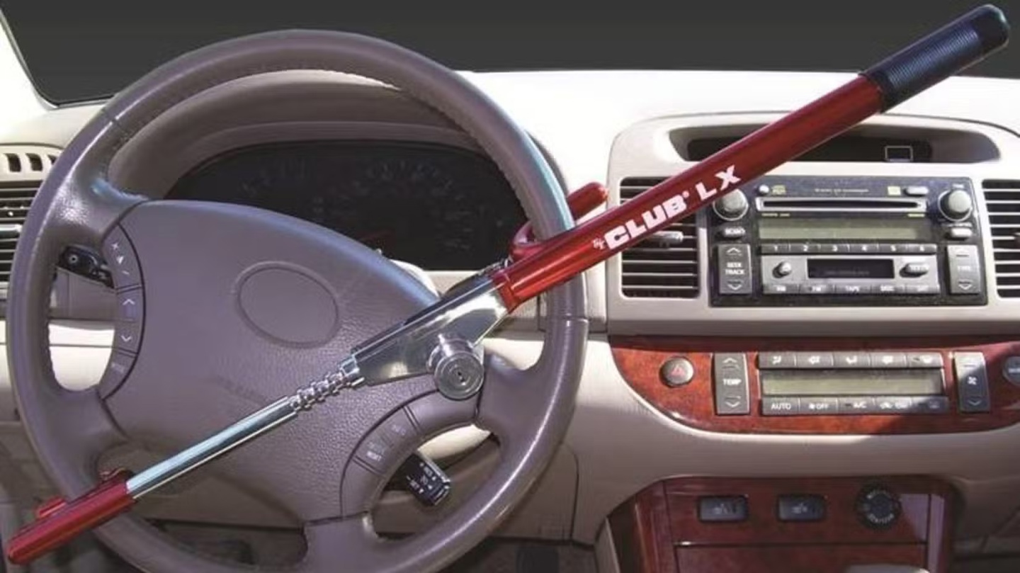 方向盘锁 1986 年就已问世,其工作原理极为简单:将一端挂钩卡在方向盘一侧,另一端卡在对侧,拉伸连接两根挂钩的金属杆至最长,随后上锁即可。如果有人非法闯入车辆,会因无法操控方向盘而无法盗车。