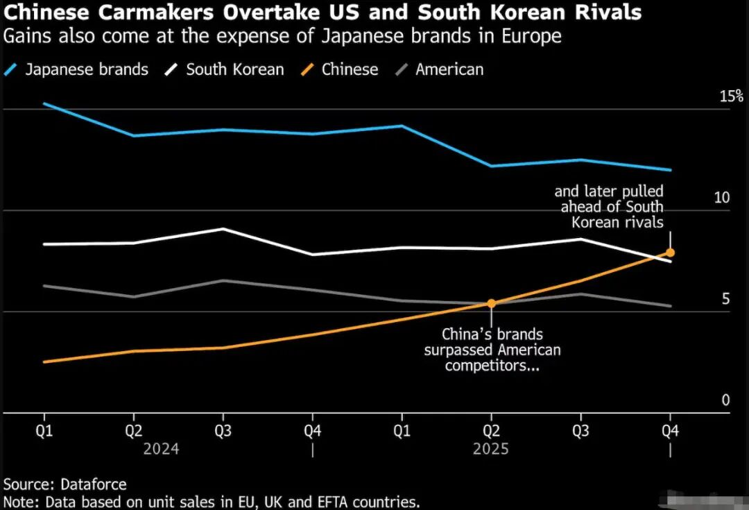 那些已在欧洲经营数十年、建立起成熟经销商体系的非欧洲品牌,如今也感受到来自中国车企的竞争压力。Dataforce数据显示,中国品牌于2025年第二季度在欧洲销量超越美国车企,并在第四季度超过了韩国汽车公司。