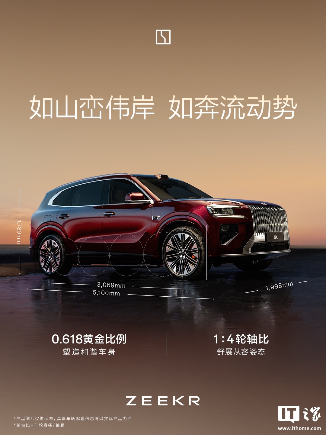 极氪 8X 定位“超级电混高性能旗舰 SUV”。新车采用 0.618 黄金比例设计、拥有 1:4 轮轴比,尺寸为 5100×1998×1780mm、轴距 3069mm。