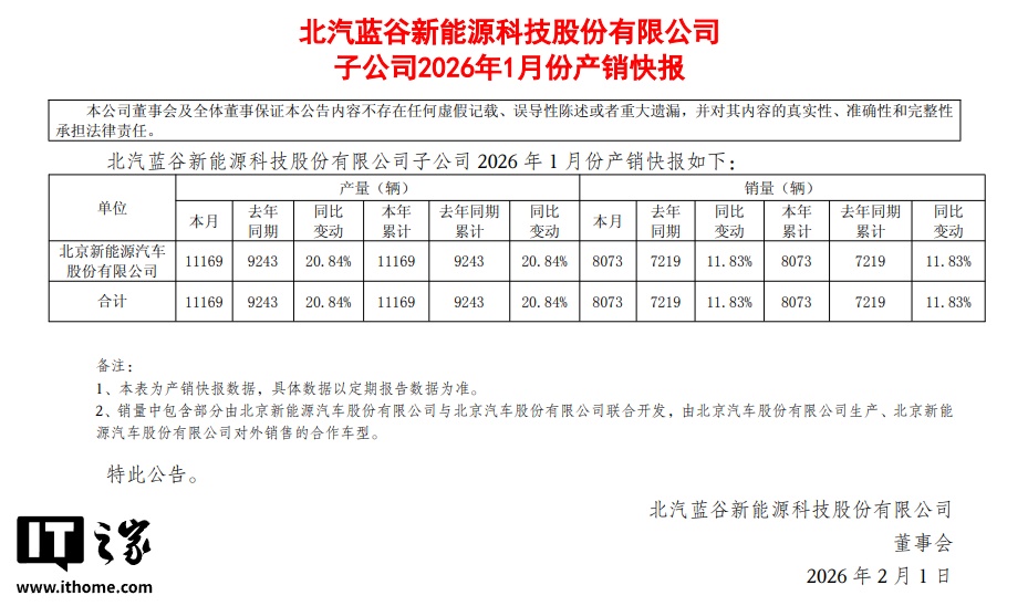 IT之家 2 月 1 日消息,北汽蓝谷新能源科技股份有限公司子公司公布了最新的 1 月产销快报。