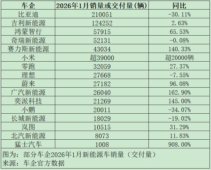 对比来看,1月仍有多家新能源车企报喜。比如,小米汽车1月的交付量超3.9万辆,超越零跑汽车首次成为造车新势力月度销冠。
