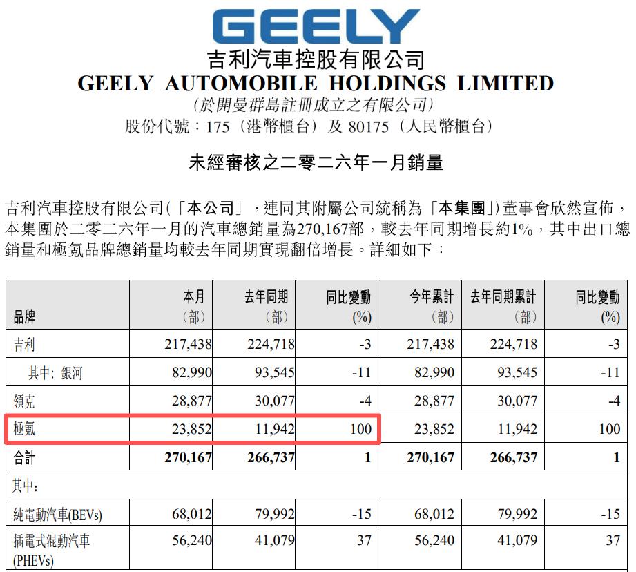产销数据显示,极氪作为吉利汽车旗下高端智能电动汽车品牌,2026年1月的销量同比增长100%至2.39万辆。据业内人士透露,2025年9月上市的极氪9X于2026年迎来爆发,销量超1万辆。