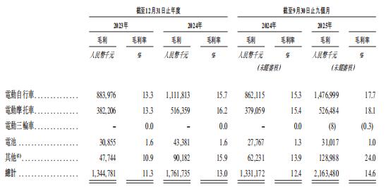 2025年前九个月,电动自行车收入贡献为56.3%,电动摩托车为19.6%。分产品看,电动自行车毛利率从2023年的13.3%提升至2025年前九个月的17.7%;电动摩托车毛利率从13.3%提升至18.1%。