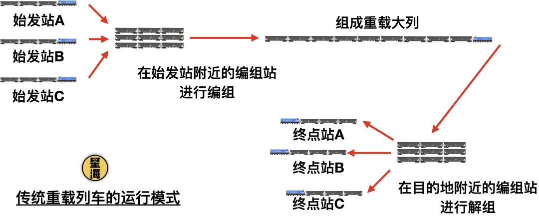 以大秦铁路上的重载煤炭运输列车来说,传统模式下,上百节列车、几万吨煤炭并不是在同一个地方装载的,往往是从多个煤矿装成几个小列车,最后在编组站里组装成大列一起运走的。
