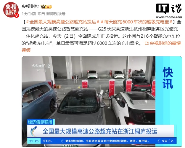 IT之家 2 月 2 日消息,据央视财经报道,全国规模最大的高速公路智慧超充站 ——G25 长深高速浙江杭州桐庐服务区光储充一体化超充站,今天全面建成并正式投运。这座拥有 216 个智能充电车位的“超级充电宝”,单日最高可满足超过 6000 车次的充电需求。