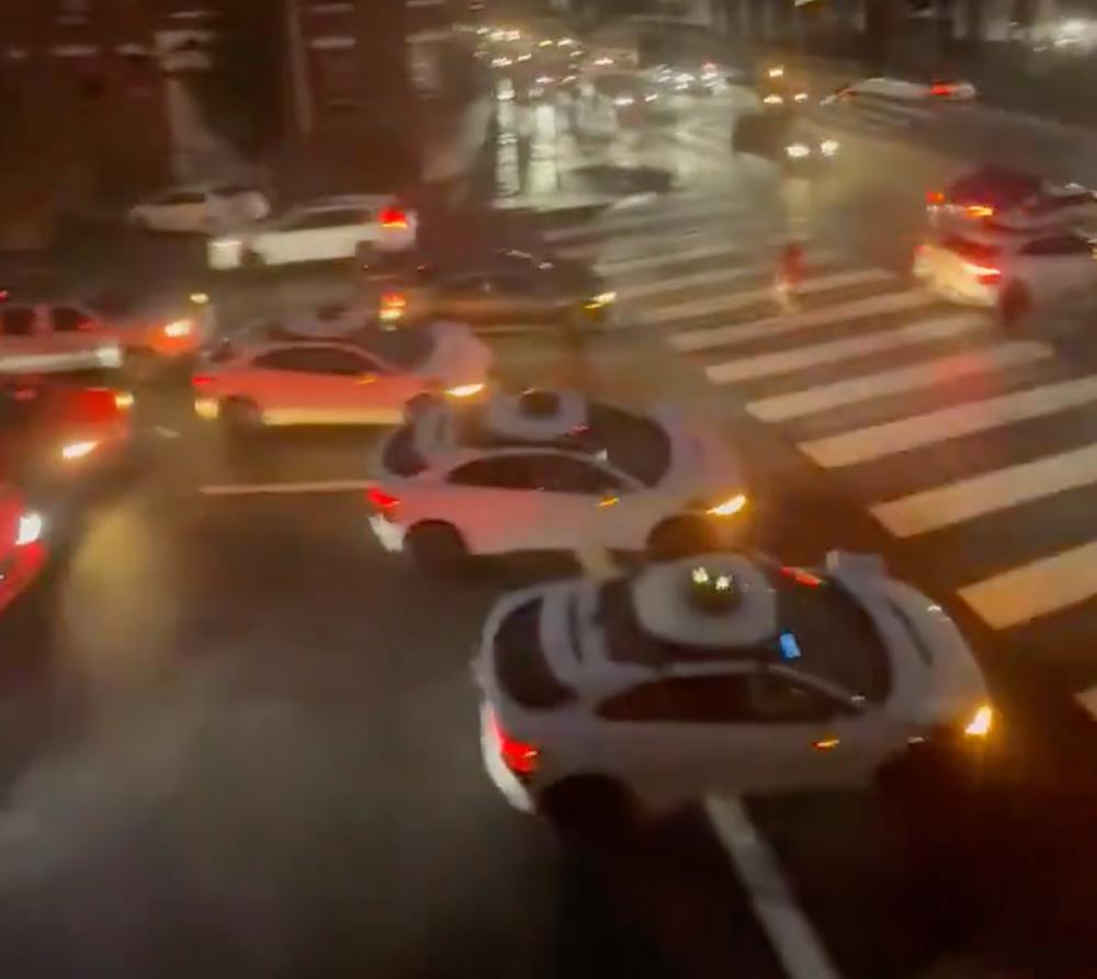 多辆Waymo Robotaxi打双闪靠边停车引发拥堵